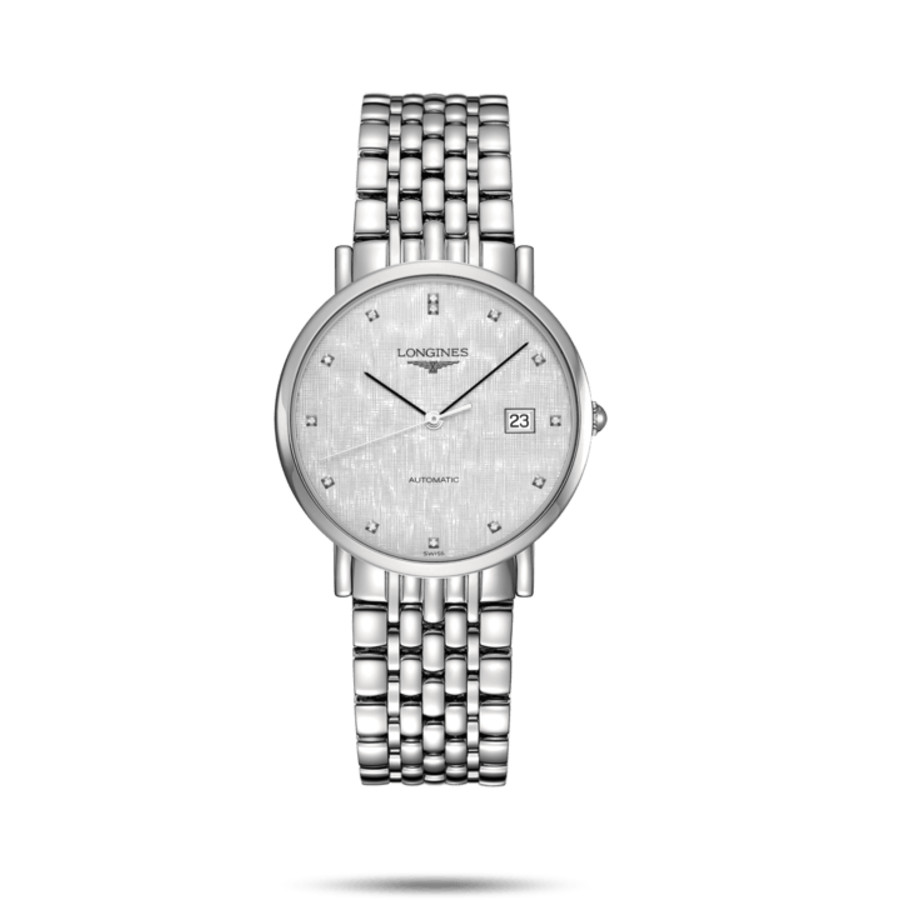 Stainless steel case with a stainless steel bracelet. Fixed stainless steel bezel. Striped silver dial with black hands and diamond hour markers. Dial Type: Analog. Date display at the 3 o'clock position. Longines Calibre L888 Automatic movement, based upon ETA A31.L11, containing 21 Jewels, bitting at 25200 vph, and has a power reserve of approximately 64 hours. Scratch resistant sapphire crystal. Pull / push crown. Transparent case back. Round case shape. Case size: 37 mm. Band width: 19 mm. Fold over clasp. Water resistant at 30 meters / 100 feet. Functions: date, hour, minute, second. Additional Info: dial set with 13 top wesselton vs-si diamonds, for a total of 0.032 cts. Elegant Series. Dress watch style. Watch label: Swiss Made. Longines Elegant Automatic Diamond Mens Watch L4.810.4.77.6.