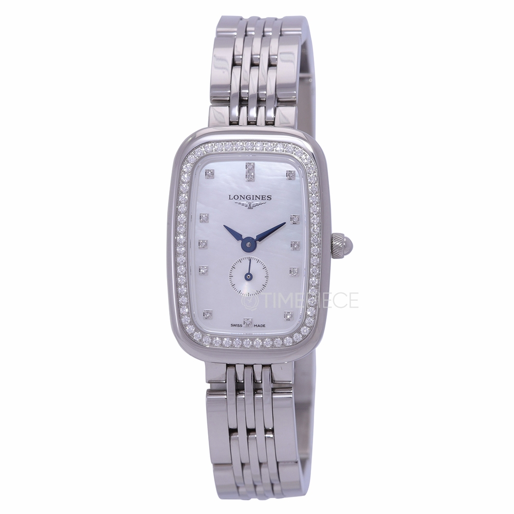 Silver-tone stainless steel case and bracelet. Fixed silver-tone bezel with diamond set stainless steel. Mother of pearl dial with blue hands and diamond hour markers. Dial Type: Analog. Longines Caliber L178 quartz movement. Scratch resistant sapphire crystal. Pull / push crown. Solid case back. Rectangle case shape, case size: 22 mm, case thickness: 6.2 mm. Band width: 12 mm, band length: 7 inches. Deployment with push button release clasp. Water resistant at 30 meters / 100 feet. Functions: hour, minute, second. Additional Info: hours, minutes, small seconds, battery eol indicator. Equestrian Series. Luxury watch style. Watch label: Swiss Made. Longines Equestrian Quartz Diamond Ladies Watch L6.141.0.87.6.