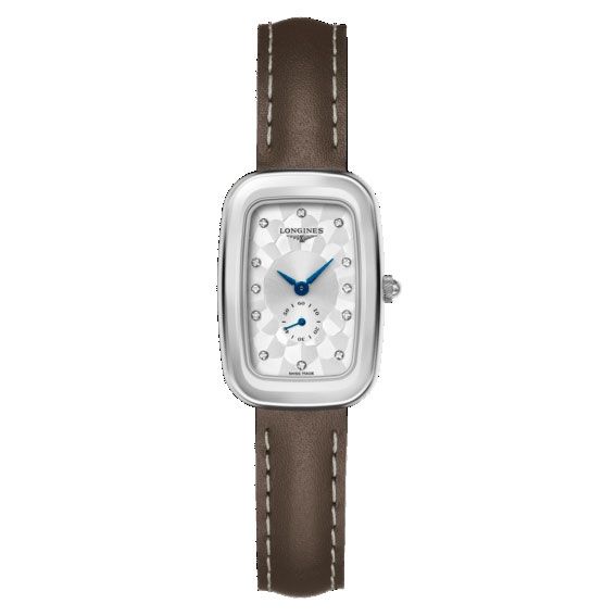 Stainless steel case with a brown leather strap. Fixed stainless steel bezel. Silver dial with blue hands and diamond hour markers. Dial Type: Analog. Small seconds sub-dial. ETA caliber 980.153 quartz movement. Scratch resistant sapphire crystal. Pull / push crown. Solid case back. Rectangle case shape. Case dimensions: 22 mm x 32 mm. Band width: 12 mm. Tang clasp. Water resistant at 30 meters / 100 feet. Functions: hour, minute, small second, battery EOL indicator. Equestrian Series. Dress watch style. Watch label: Swiss Made. Longines Equestrian Quartz Diamond Silver Dial Ladies Watch L6.141.4.77.2.