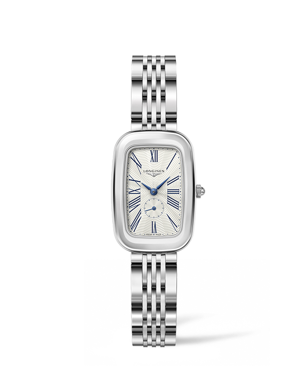 Stainless steel case with a stainless steel bracelet. Fixed polished stainless steel bezel. Silver flinque dial with blued steel hands and Roman numeral hour markers. Minute markers around the outer rim. Dial Type: Analog. One subdial displaying: small seconds. Longines caliber L178 quartz movement. Scratch resistant sapphire crystal. Pull / push crown. Solid case back. Rectangle case shape. Case dimensions: 32 mm x 22 mm. Band width: 14 mm. Fold over clasp. Water resistant at 30 meters / 100 feet. Functions: hour, minute, second. Equestrian Series. Casual watch style. Watch label: Swiss Made. Longines Equestrian Quartz Ladies Watch L6.141.4.71.6.
