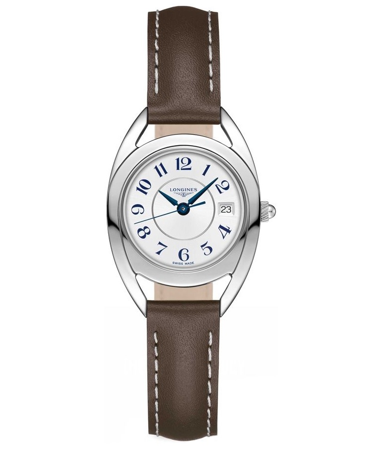 Stainless steel case with a brown leather strap. Fixed stainless steel bezel. White dial with blue hands and Arabic numeral hour markers. Dial Type: Analog. Date display at the 3 o'clock position. Longines calibre L152 quartz movement. Scratch resistant sapphire crystal. Pull / push crown. Solid case back. Oval case shape. Case size: 26 mm. Case thickness: 9 mm. Band width: 12 mm. Tang clasp. Water resistant at 30 meters / 100 feet. Functions: date, hour, minute, second. Equestrian Series. Dress watch style. Watch label: Swiss Made. Item Variations: L6.136.4.73.2. Longines Equestrian Quartz White Dial Ladies Watch L6.136.4.73.2.
