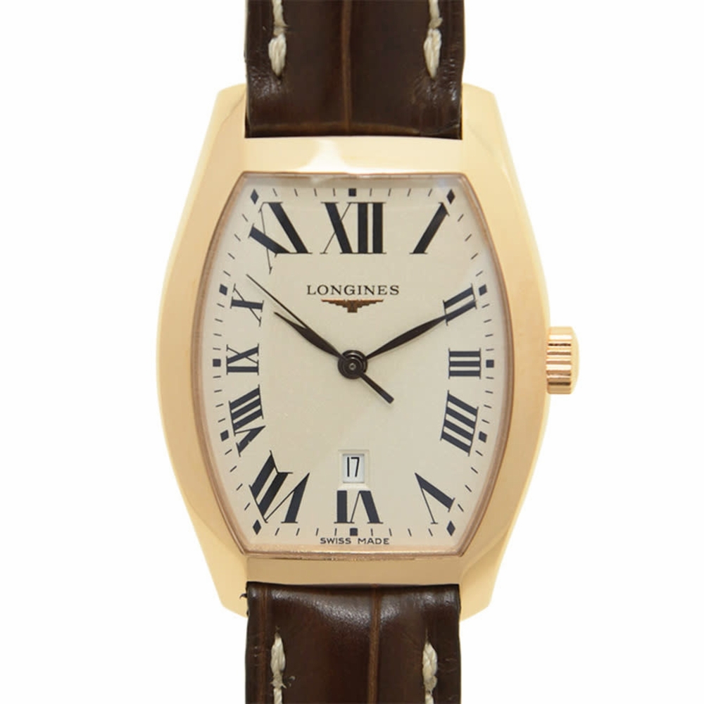 18kt rose gold case with a brown alligator/crocodile leather strap. Fixed bezel. Silver dial. Dial Type: Analog. Date display at the 6 o'clock position. Longines Calibre L152 quartz movement. Scratch resistant sapphire crystal. Pull / push crown. Solid case back. Tonneau case shape, case size: 30.6 mm x 26 mm, case thickness: 8.1 mm. Tang buckle clasp. Water resistant at 30 meters / 100 feet. Functions: date, hour, minute, second. Evidenza Series. Watch label: Swiss Made. Longines Evidenza Quartz Silver Dial Ladies Watch L2.155.8.71.2.