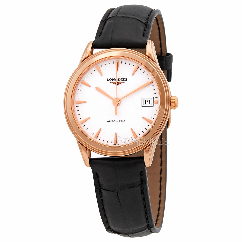 18kt rose gold case with a black (alligator) leather strap. Fixed 18kt rose gold bezel. White dial with rose gold-tone hands and index hour markers. Minute markers around the outer rim. Dial Type: Analog. Date display at the 3 o'clock position. Longines calibre L619 automatic movement, based upon ETA 2892-A2, containing 21 Jewels, bitting at 28800 vph, and has a power reserve of approximately 42 hours. Scratch resistant sapphire crystal. Pull / push crown. Transparent case back. Round case shape. Case size: 35.5 mm. Case thickness: 8 mm. Tang clasp. Water resistant at 30 meters / 100 feet. Functions: date, hour, minute, second. Flagship Series. Casual watch style. Watch label: Swiss Made. Longines Flagship Automatic White Dial Mens Watch L4.774.8.22.2.