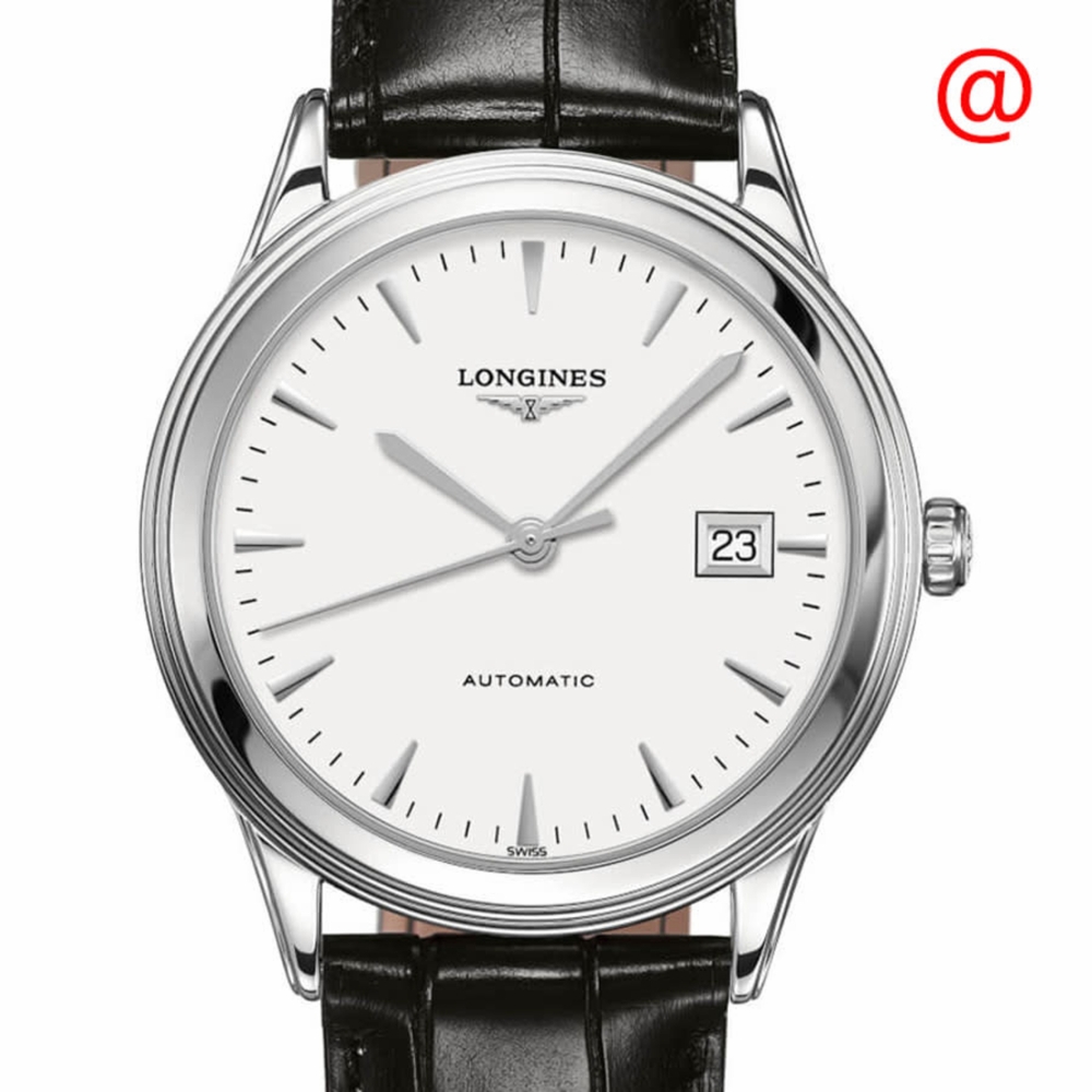 Silver-tone stainless steel case with a black alligator/crocodile leather strap. Fixed stainless steel bezel. White dial with silver-tone hands and index hour markers. Dial Type: Analog. Date display at the 3 o'clock position. Longines Calibre L888 Automatic movement, based upon ETA A31.L11, containing 21 Jewels, bitting at 25200 vph, and has a power reserve of approximately 64 hours. Scratch resistant sapphire crystal. Pull / push crown. Transparent case back. Round case shape, case size: 38.5 mm, case thickness: 8 mm. Tang buckle clasp. Water resistant at 30 meters / 99 feet. Functions: date, hour, minute, second. Flagship Series. Dress watch style. Watch label: Swiss Made. Longines Flagship Automatic White Dial Mens Watch L4.974.4.12.2.