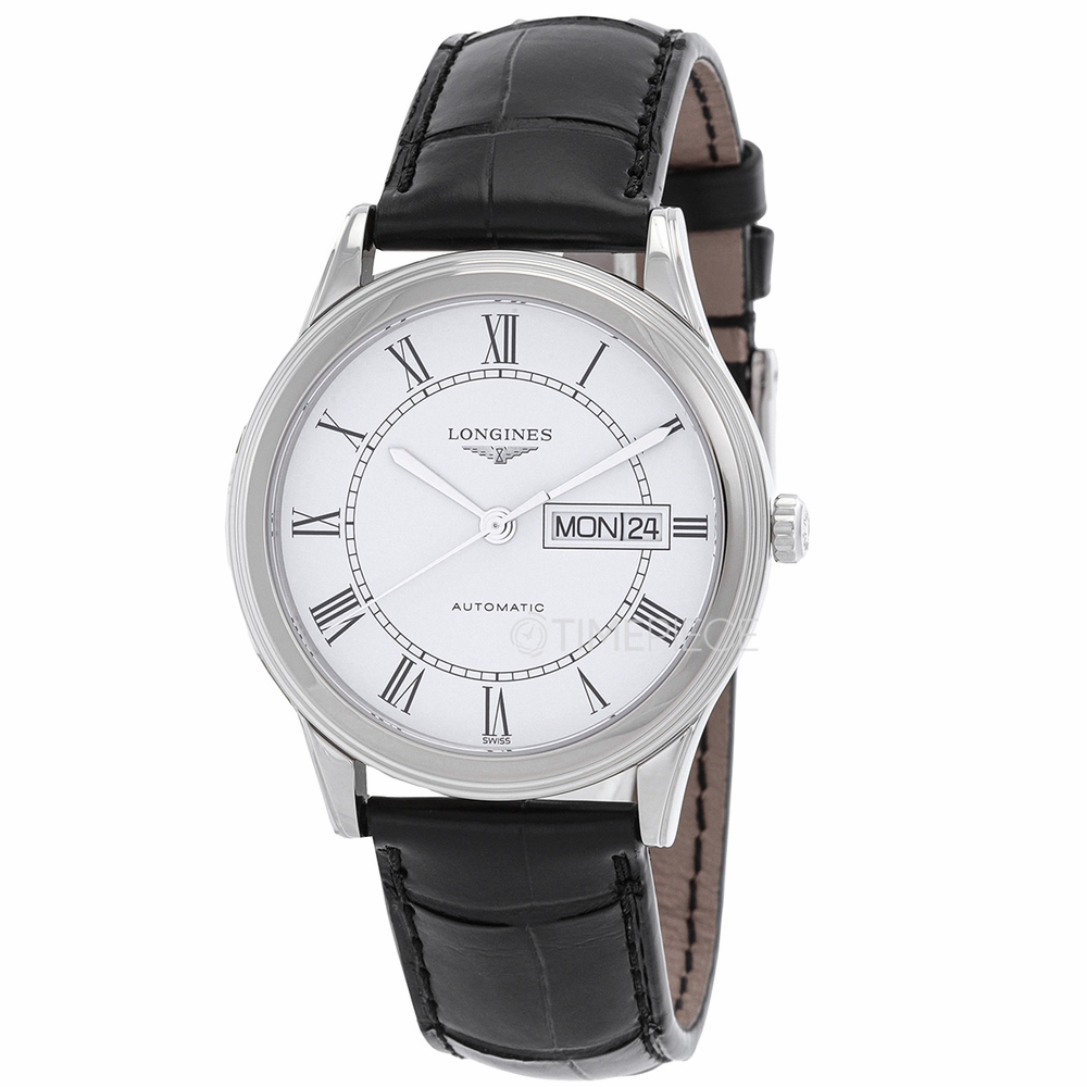 Silver-tone stainless steel case with a black alligator leather strap. Fixed silver-tone stainless steel bezel. White dial with silver-tone hands and Roman numeral hour markers. Minute scale around the inner rim. Dial Type: Analog. Day of the week and date display at the 3 o'clock position. Longines Calibre L636 automatic movement with a 38-hour power reserve. Scratch resistant sapphire crystal. Pull / push crown. Transparent case back. Round case shape. Case size: 38.5 mm. Buckle clasp. Water resistant at 30 meters / 100 feet. Functions: date, day, hour, minute, second. Luxury watch style. Watch label: Swiss Made. Longines Flagship Automatic White Dial Watch L4.899.4.21.2.