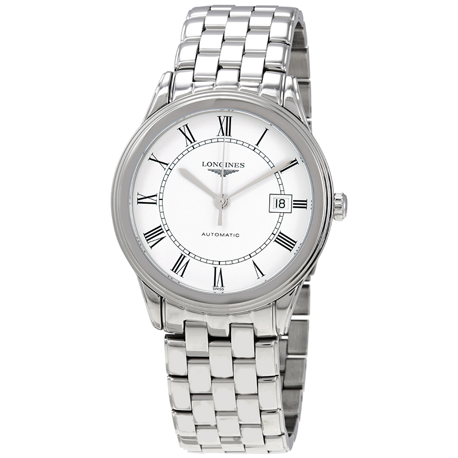 Stainless steel case with a stainless steel bracelet. Fixed stainless steel bezel. White matte dial with silver-tone hands and Roman numeral hour markers. Minute markers around an inner ring. Dial Type: Analog. Date display at the 3 o'clock position. Longines calibre L888 automatic movement, based upon ETA A31.L11, containing 21 Jewels, bitting at 25200 vph, and has a power reserve of approximately 64 hours. Scratch resistant sapphire crystal. Push / pull crown. Transparent case back. Round case shape. Case size: 38.5 mm. Case thickness: 8 mm. Band width: 20 mm. Fold over clasp with a push button release. Water resistant at 30 meters / 100 feet. Functions: date, hour, minute, second. Dress watch style. Watch label: Swiss Made. Longines Flagship Automatic White Matte Dial Mens Watch L49744216.