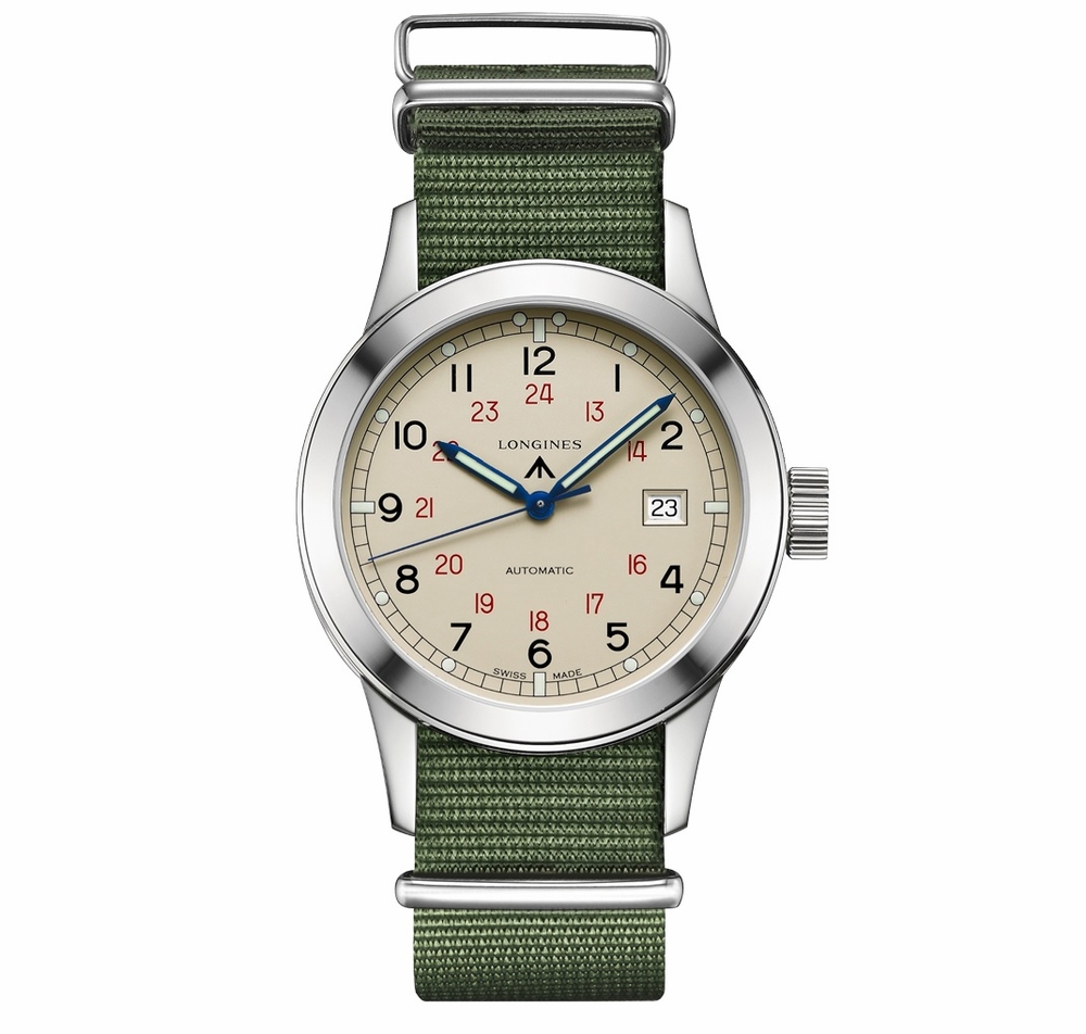 Stainless steel case with a green fabric strap. Fixed stainless steel bezel. Ivory dial with luminous blue hands and Arabic numeral hour markers. 24 hour markers. Inute markers around the outer rim. Dial Type: Analog. Luminescent hands. Date display at the 3 o'clock position. Longines calibre L619 automatic movement, based upon ETA 2892-A2, containing 21 Jewels, bitting at 28800 vph, and has a power reserve of approximately 42 hours. Scratch resistant sapphire crystal. Pull / push crown. Solid case back. Round case shape. Case size: 40 mm. Case thickness: 10 mm. Band width: 20 mm. Tang clasp. Water resistant at 30 meters / 100 feet. Functions: date, hour, minute, second, military. Heritage Series. Dress watch style. Watch label: Swiss Made. Longines Heritage Automatic Ivory Dial Mens Watch L2.832.4.73.5.