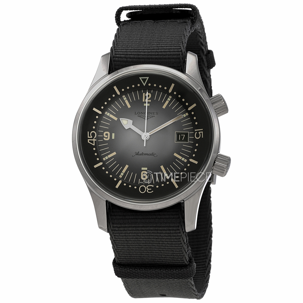 Silver-tone stainless steel case with a grey nylon strap. Fixed silver-tone stainless steel bezel. Grey dial with silver-tone hands and index hour markers. Minute markers around the outer rim. Dial Type: Analog. Luminescent hands and markers. Date display at the 3 o'clock position. Longines Calibre L888 Automatic movement, based upon ETA A31.L11, containing 21 Jewels, bitting at 25200 vph, and has a power reserve of approximately 64 hours. Scratch resistant sapphire crystal. Screw down crown. Solid case back. Round case shape, case size: 42 mm. Buckle clasp. Water resistant at 300 meters / 1000 feet. Functions: date, hour, minute, second. Additional Info: original box, international warranty card, manual (complete accessories). Legend Diver Series. Luxury watch style. Watch label: Swiss Made. Longines Legend Diver Automatic Grey Dial Mens Watch L3.774.4.70.2.