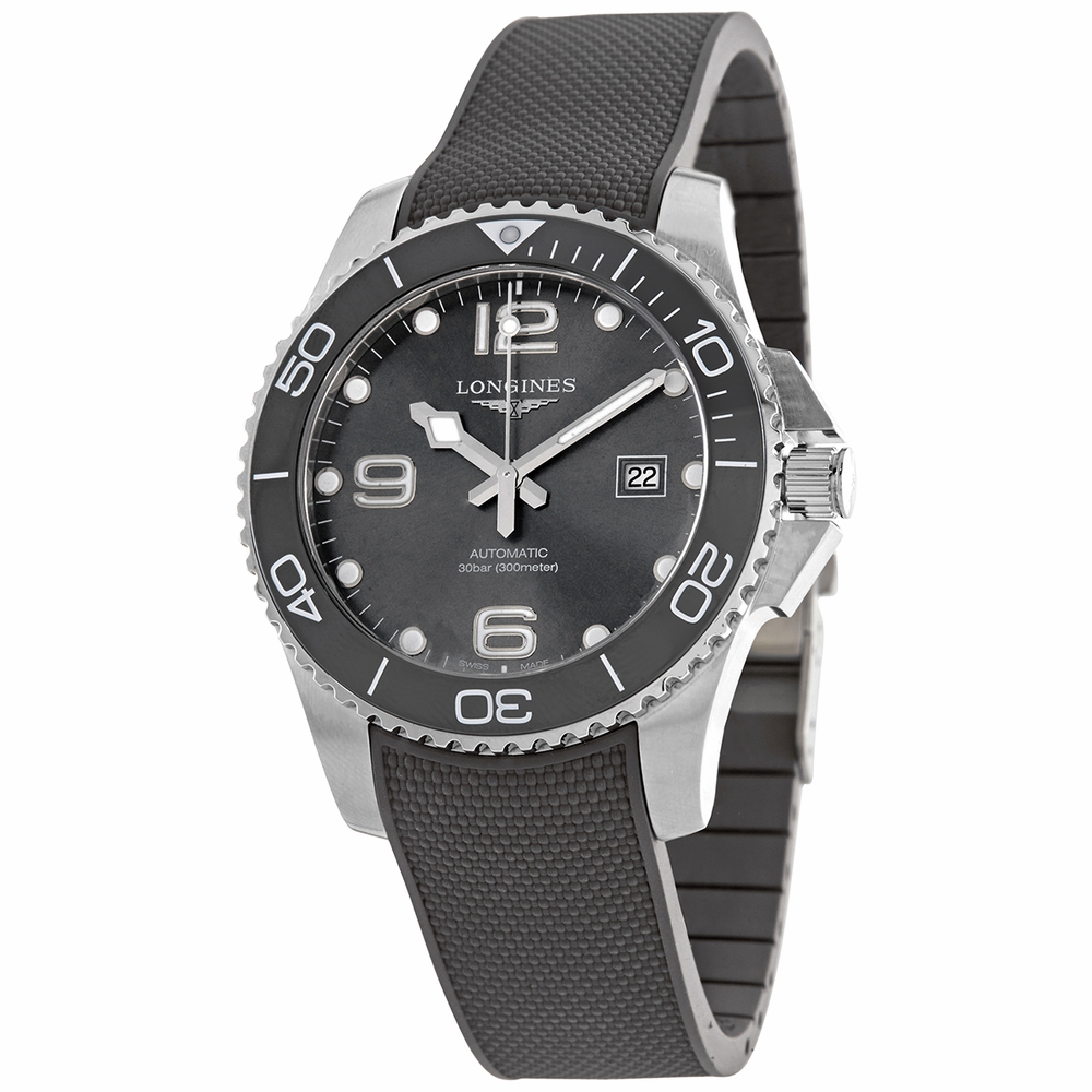 Stainless steel case with a grey rubber strap. Uni-directional rotating coin edge stainless steel bezel with a grey ceramic ring. Grey dial with luminous silver-tone hands and dot hour markers. Arabic numerals mark the 6, 9 and 12 o'clock positions. Minute markers around the outer rim. Dial Type: Analog. Luminescent hands and markers. Date display at the 3 o'clock position. Longines calibre L619/888 automatic movement, based upon ETA 2892, containing 21 Jewels, bitting at 25200 vph, and has a power reserve of approximately 64 hours. Scratch resistant sapphire crystal. Screw down crown. Solid case back. Round case shape. Case size: 43 mm. Band width: 21 mm. Fold over clasp. Water resistant at 300 meters / 1000 feet. Functions: date, hour, minute, second. Hydroconquest Series. Dive watch style. Watch label: Swiss Made. Longines Hydroconquest Automatic Grey Dial Mens Watch L3.782.4.76.9.