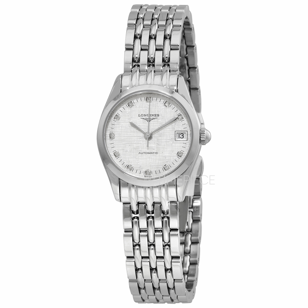 Silver-tone stainless steel case and bracelet. Fixed silver-tone stainless steel bezel. Silver dial with silver-tone hands and diamond hour markers. Minute markers around the outer rim. Dial Type: Analog. Date display at the 3 o'clock position. Automatic movement with a 40-hour power reserve. Scratch resistant sapphire crystal. Pull / push crown. Solid case back. Round case shape, case size: 25 mm, case thickness: 8 mm. Band width: 14 mm. Deployment clasp. Water resistant at 30 meters / 100 feet. Functions: date, hour, minute, second. La Grande Classique Series. Dress watch style. Watch label: Swiss. Longines La Grande Classique Automatic Diamond Silver Dial Ladies Watch L4.298.4.77.6.