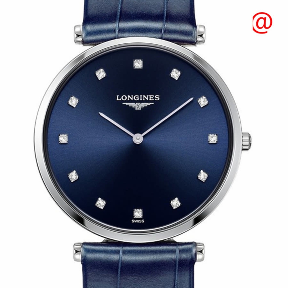 Stainless steel case with a blue alligator/crocodile leather strap. Fixed bezel. Blue dial with silver-tone hands and diamond hour markers. Dial Type: Analog. Quartz movement. Scratch resistant sapphire crystal. Pull / push crown. Solid case back. Round case shape, case size: 33 mm, case thickness: 5 mm. Tang buckle clasp. Water resistant at 30 meters / 99 feet. Functions: hour, minute. La Grande Classique Series. Dress watch style. Watch label: Swiss Made. Longines La Grande Classique Quartz Diamond Blue Dial Ladies Watch L4.709.4.97.2.