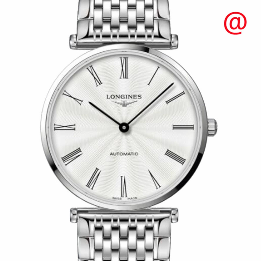 Silver-tone stainless steel case and bracelet. Fixed silver-tone stainless steel bezel. Silver-tone dial with black hands and Roman numeral hour markers. Dial Type: Analog. Longines Calibre L591 Automatic movement, based upon ETA A20.L01, containing 22 Jewels, bitting at 28800 vph, and has a power reserve of approximately 40 hours. Scratch resistant sapphire crystal. Round case shape, case size: 38 mm. Fold over clasp. Functions: hour, minute. Additional Info: original box, international warranty card, manual (complete accessories). La Grande Series. Luxury watch style. Watch label: Swiss Made. Longines La Grande Automatic Silver Dial Mens Watch L4.918.4.71.6.