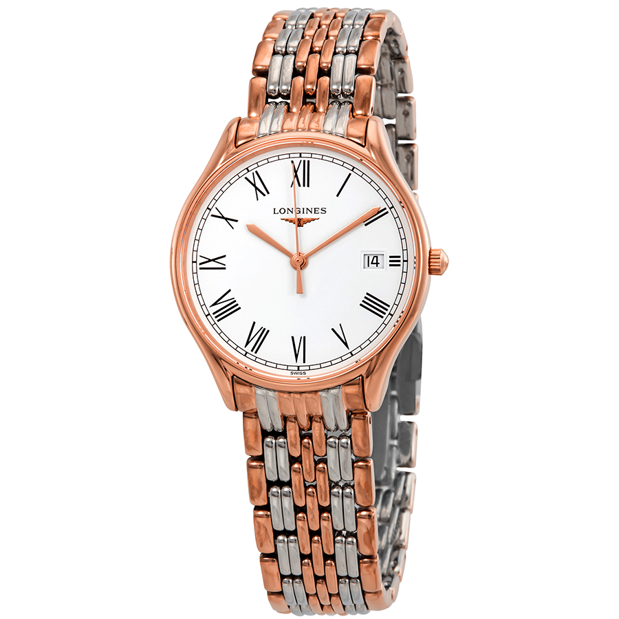 Rose gold-tone stainless steel case with a two-tone (silver-tone and rose gold PVD) stainless steel bracelet. Fixed rose gold PVD bezel. White matt dial with rose gold-tone hands and Roman numeral hour markers. Minute markers around the outer rim. Dial Type: Analog. Date display at the 3 o'clock position. Longines Calibre L156 quartz movement. Scratch resistant sapphire crystal. Pull / push crown. Solid case back. Round case shape. Case size: 32 mm. Fold over clasp with a safety release. Water resistant at 30 meters / 100 feet. Functions: date, hour, minute, second. Lyre Series. Casual watch style. Watch label: Swiss Made. Longines Lyre White Matt Dial Ladies Two Tone Watch L43591117.