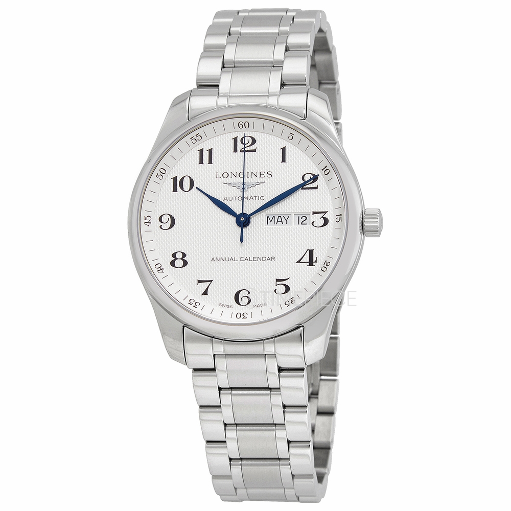 Stainless steel case with a silver-tone stainless steel bracelet. Fixed stainless steel bezel. Silver-tone dial with Arabic numeral hour markers. Minute markers around the outer rim. Dial Type: digital. Annual calendar - month and date. Longines Calibre L897 Automatic movement, based upon ETA A31.L81, containing 21 Jewels, bitting at 25200 vph, and has a power reserve of approximately 64 hours. Scratch resistant sapphire crystal. Pull / push crown. Transparent case back. Round case shape, case size: 42 mm. Band width: 21 mm. Fold over clasp. Water resistant at 30 meters / 100 feet. Functions: annual calendar, month, date, hour, minute, second, chronometer. Master Series. Sport watch style. Watch label: Swiss Made. Longines Master Automatic Digital Chronometer Silver Dial Mens Watch L2.920.4.78.6.