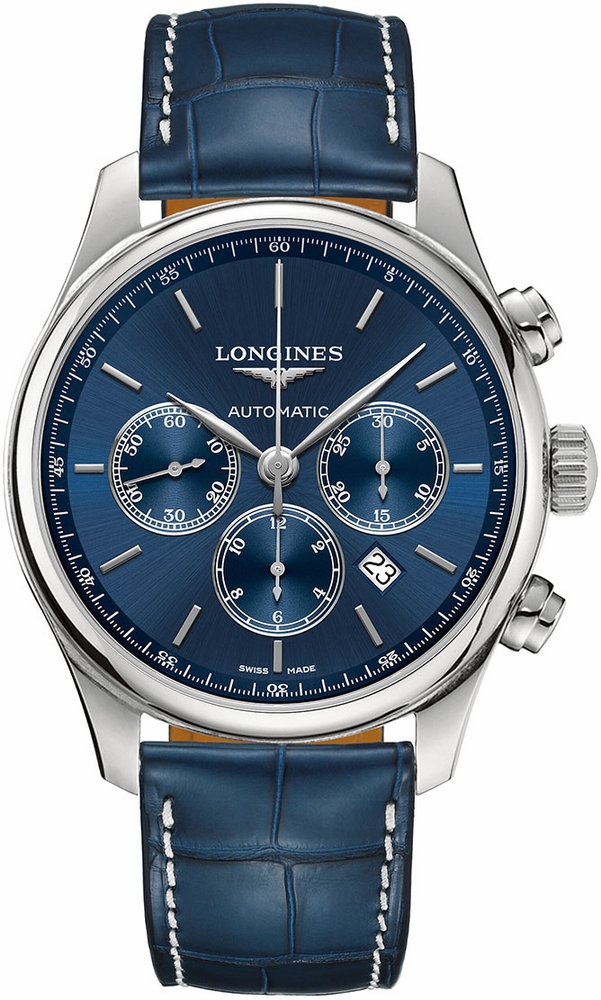 Stainless steel case with a blue (alligator) leather strap. Fixed stainless steel bezel. Blue sunray dial with polished silver-tone hands and index hour markers. Arabic numeral minute markers (at 5 minute intervals). Minute markers around the outer rim. Dial Type: Analog. Date display between the 4 and 5 o'clock positions. Chronograph - three sub-dials displaying: 60 second, 30 minute and 12 hours. Longines calibre L688 automatic movement, based upon ETA A08.L01, containing 27 Jewels, bitting at 28800 vph, and has a power reserve of approximately 54 hours. Scratch resistant sapphire crystal. Pull / push crown. Transparent case back. Round case shape. Case size: 44 mm. Case thickness: 14.40 mm. Band width: 22 mm. Fold over clasp. Water resistant at 30 meters / 100 feet. Functions: chronograph, date, hour, minute, second. Master Series. Dress watch style. Watch label: Swiss Made. Longines Master Chronograph Automatic Mens Watch L2.859.4.92.0.