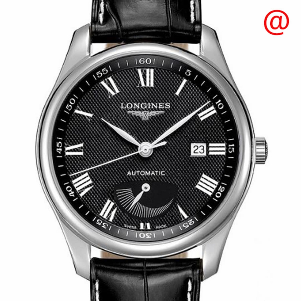 Silver-tone stainless steel case with a black alligator/crocodile leather strap. Fixed stainless steel bezel. Black dial with silver-tone hands and Roman numeral hour markers. Dial Type: Analog. Date display at the 3 o'clock position. Automatic movement. Scratch resistant sapphire crystal. Pull / push crown. Transparent see through case back. Round case shape, case size: 40 mm, case thickness: 10 mm. Push button deployant buckle clasp. Water resistant at 30 meters / 99 feet. Functions: date, hour, minute, second, power reserve. Master Collection Series. Dress watch style. Watch label: Swiss Made. Longines Master Collection Automatic Black Dial Mens Watch L2.908.4.51.7.