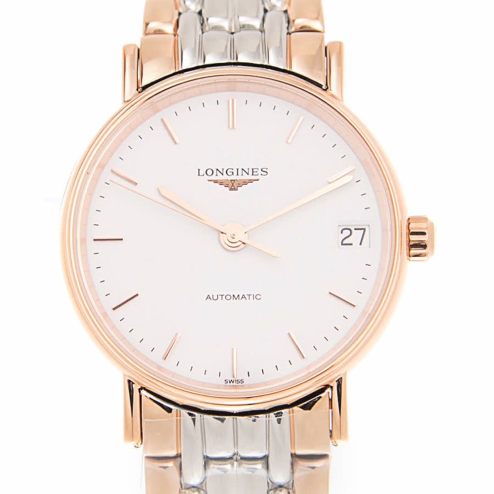Stainless steel case with a two-tone (silver-tone and rose gold PVD) stainless steel bracelet. Fixed rose gold PVD bezel. White dial with rose gold-tone hands and index hour markers. Minute markers around an inner ring. Dial Type: Analog. Date display at the 3 o'clock position. Longines calibre L619/888 automatic movement, based upon ETA 2892, containing 21 Jewels, bitting at 25200 vph, and has a power reserve of approximately 64 hours. Scratch resistant sapphire crystal. Pull / push crown. Transparent case back. Round case shape. Case size: 30 mm. Case thickness: 7.6 mm. Band width: 16 mm. Fold over clasp with a push button release. Water resistant at 30 meters / 100 feet. Functions: date, hour, minute, second. Presence Series. Dress watch style. Watch label: Swiss Made. Longines Presence Automatic White Dial Ladies Watch L4.322.1.12.7.