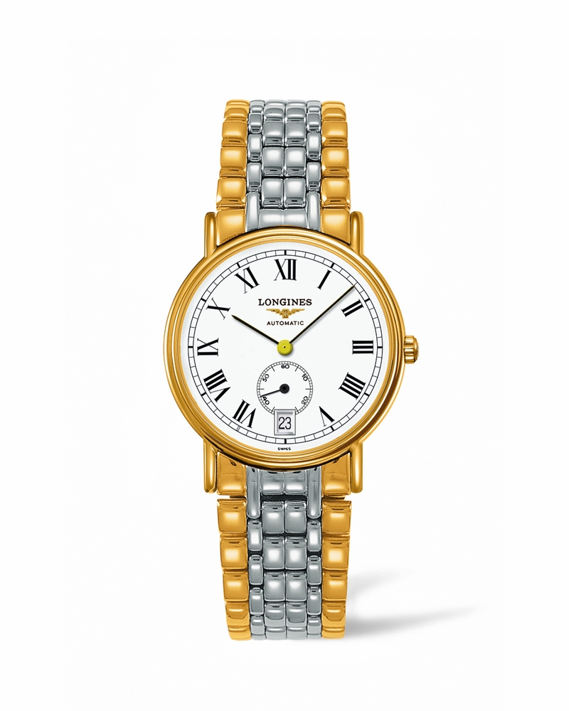 Gold PVD stainless steel case with a two-tone (silver-tone and gold PVD) stainless steel bracelet. Fixed gold PVD bezel. White dial with black hands and Roman numeral hour markers. Minute markers around the outer rim. Dial Type: Analog. Date display at the 6 o'clock position. Small seconds sub-dial. Longines caliber L615.2 automatic movement with a 42 mm power reserve. Scratch resistant sapphire crystal. Pull / push crown. Transparent case back. Round case shape. Case size: 34.5 mm. Case thickness: 8 mm. Band width: 18 mm. Fold over clasp with a push button release. Water resistant at 30 meters / 100 feet. Functions: date, hour, minute, second. Presence Series. Dress watch style. Watch label: Swiss Made. Longines Presence Automatic White Dial Mens Watch L4.804.2.11.7.