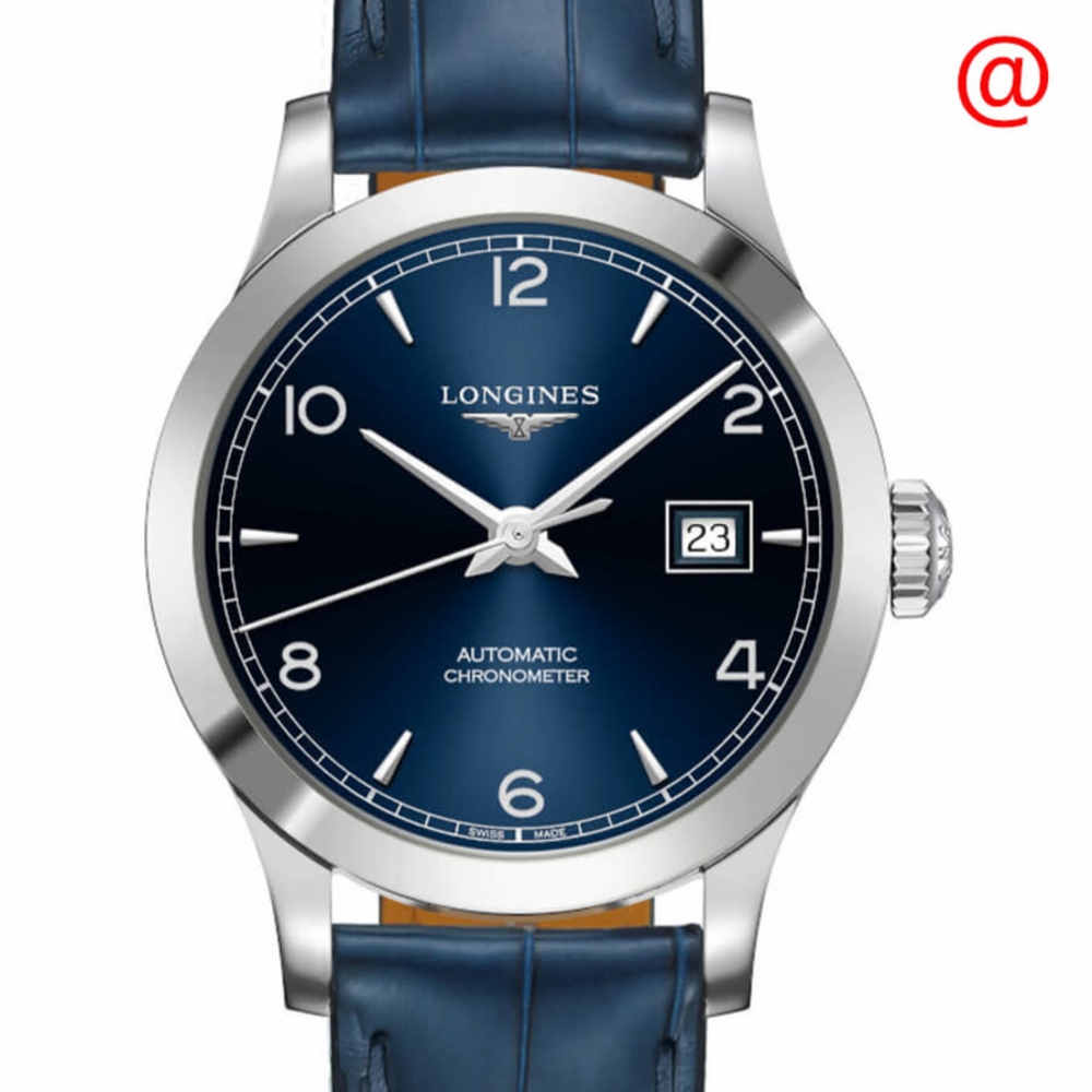 Silver-tone stainless steel case with a blue alligator/crocodile leather strap. Fixed stainless steel bezel. Blue dial with silver-tone hands and index-Arabic numerals hour markers. Dial Type: Analog. Date display at the 3 o'clock position. Caliber L592.4 (ETA A20.L11) beats at 28'800 vph automatic movement. Scratch resistant sapphire crystal. Pull / push crown. Transparent case back. Round case shape, case size: 30 mm. Push button deployant buckle clasp. Water resistant at 30 meters / 99 feet. Functions: date, hour, minute, second. Record Series. Dress watch style. Watch label: Swiss Made. Longines Record Automatic Blue Dial Ladies Watch L23214964.