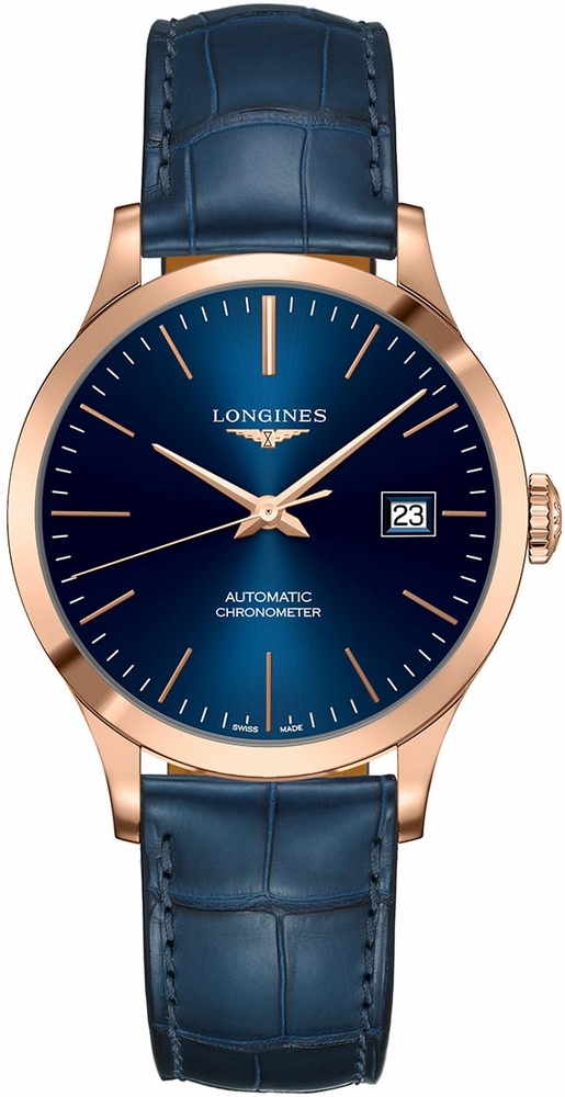 18kt rose gold case with a blue alligator leather strap. Fixed rose gold 18kt rose gold bezel. Blue dial with rose gold hands and Roman numeral hour markers. Minute markers around the outer rim. Dial Type: Analog. Date display at the 3 o'clock position. Longines Calibre L888.4 Automatic movement, based upon ETA A31.L11, containing 21 Jewels, bitting at 25200 vph, and has a power reserve of approximately 64 hours. Scratch resistant sapphire crystal. Pull / push crown. Transparent see through case back. Round case shape, case size: 38.50 mm. Triple safety folding clasp. Water resistant at 30 meters / 100 feet. Functions: date, hour, minute, second, chronometer. Record Series. Luxury watch style. Watch label: Swiss Made. Longines Record Automatic Chronometer Blue Dial Unisex Watch L2.820.8.92.2.