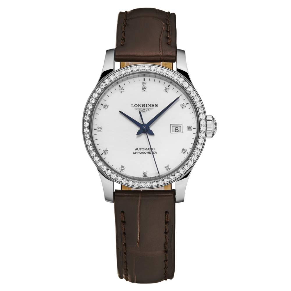 Silver-tone stainless steel case with a brown alligator/crocodile leather strap. Fixed stainless steel bezel. Mother of pearl dial with blue hands and diamond hour markers. Dial Type: Analog. Date display at the 3 o'clock position. ETA Caliber L592.4 ( A20.L11) beats at 28'800 vph automatic movement. Scratch resistant sapphire crystal. Pull / push crown. Transparent case back. Round case shape, case size: 30 mm. Push button deployant buckle clasp. Water resistant at 30 meters / 99 feet. Functions: date, hour, minute, second. Record Series. Luxury watch style. Watch label: Swiss Made. Longines Record Automatic Diamond Ladies Watch L2.321.0.87.2.