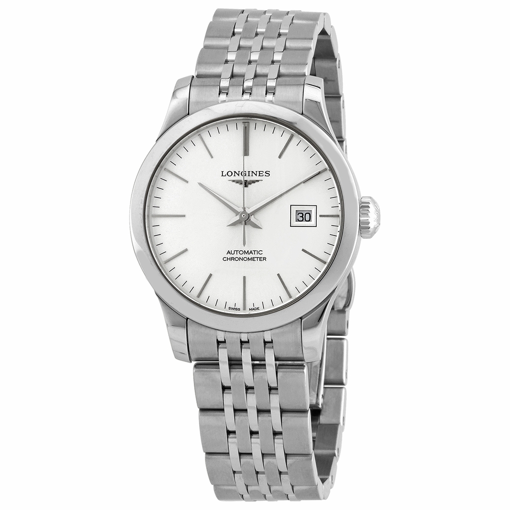 Stainless steel case with stainless steel bracelet. Fixed stainless steel bezel. Silver sunray dial with silver-tone hands and index hour markers. Minute markers around the outer rim. Dial Type: Analog. Date display at the 3 o'clock position. Longines calibre L592.4 automatic movement, based upon ETA A20.L11, containing 22 Jewels, bitting at 28800 vph, and has a power reserve of approximately 40 hours. Scratch resistant sapphire crystal. Pull / push crown. Transparent case back. Round case shape. Case size: 30 mm. Case thickness: 9 mm. Band width: 15 mm. Fold over clasp with a push button release. Water resistant at 30 meters / 100 feet. Functions: date, hour, minute, second. Record Series. Casual watch style. Watch label: Swiss Made. Longines Record Automatic Silver Dial Ladies Watch L2.321.4.72.6.