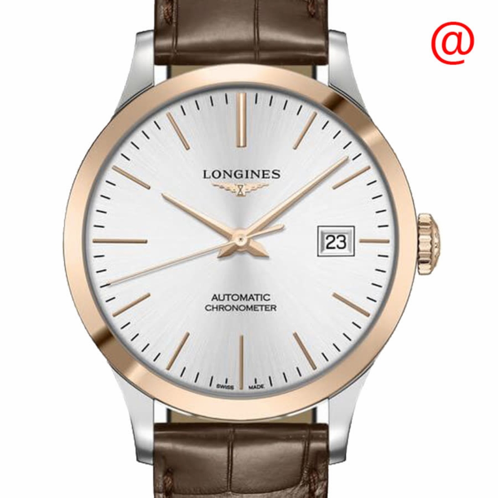 Stainless steel & plated rose gold case with a brown alligator/crocodile leather strap. Fixed bezel. Silver dial with rose gold-tone hands and index hour markers. Dial Type: Analog. Date display at the 3 o'clock position. ETA Caliber L888.4 ( a31.l11) automatic movement. Scratch resistant sapphire crystal. Pull / push crown. Transparent case back. Round case shape, case size: 38.5 mm. Push button deployant buckle clasp. Water resistant at 30 meters / 99 feet. Functions: date, hour, minute, second. Record Series. Dress watch style. Watch label: Swiss Made. Longines Record Automatic Silver Dial Mens Watch L2.820.5.72.2.