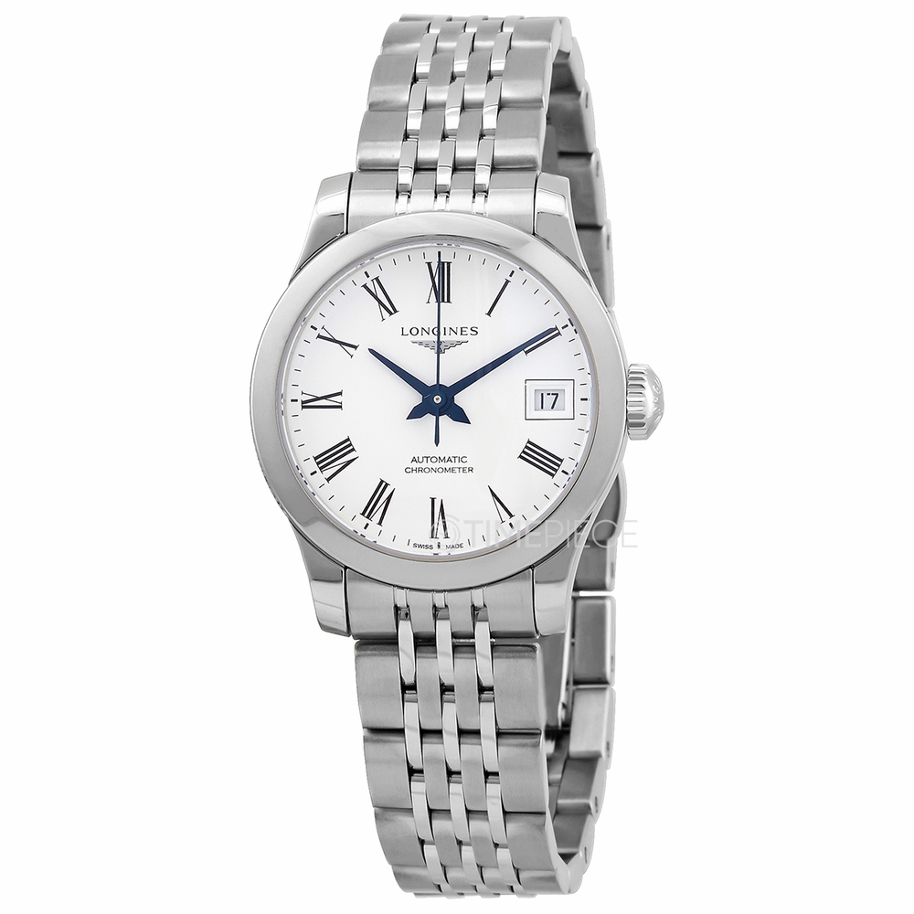 Stainless steel case with a stainless steel bracelet. Fixed stainless steel bezel. White dial with blue hands and Roman numeral hour markers. Minute markers around the outer rim. Dial Type: Analog. Date display at the 3 o'clock position. Longines calibre L592.4 automatic movement with a 40-hour power reserve. Scratch resistant sapphire crystal. Pull / push crown. Transparent case back. Round case shape. Case size: 26 mm. Case thickness: 10 mm. Band width: 13 mm. Triple fold over clasp with a safety release. Water resistant at 30 meters / 100 feet. Functions: date, hour, minute, second. Luxury watch style. Watch label: Swiss Made. Longines Record Automatic White Dial Ladies Watch L2.320.4.11.6.