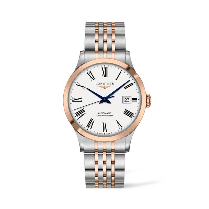 Silver-tone stainless steel case with a silver-tone stainless steel with 18kt rose gold (capped) links bracelet. Fixed 18kt rose gold (capped) stainless steel bezel. Matt white dial with blue hands and Roman numeral hour markers. Minute markers around the outer rim. Dial Type: Analog. Date display at the 3 o'clock position. Longines Calibre L888.4 Automatic movement, based upon ETA A31.L11, containing 21 Jewels, bitting at 25200 vph, and has a power reserve of approximately 64 hours. Scratch resistant sapphire crystal. Pull / push crown. Transparent see through case back. Round case shape, case size: 40 mm, case thickness: 10.8 mm. Band width: 20 mm. Fold over clasp with a push button release. Water resistant at 30 meters / 100 feet. Functions: date, hour, minute, second. Record Series. Dress watch style. Watch label: Swiss Made. Longines Record Automatic Mens Watch L2.821.5.11.7.