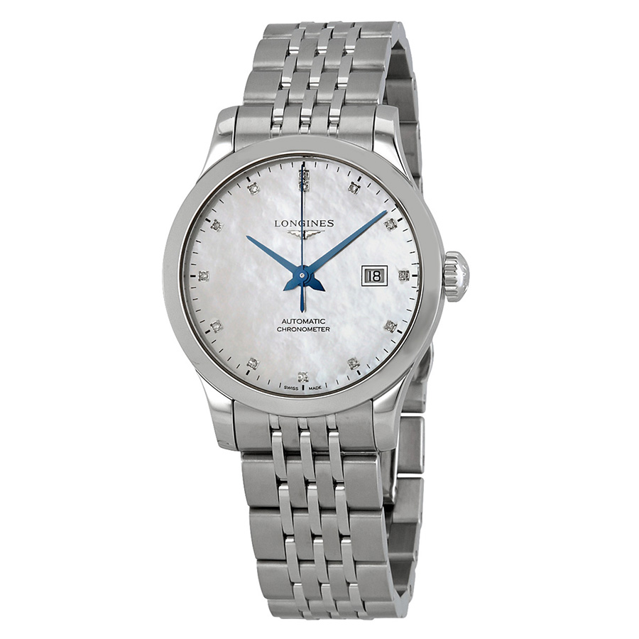 Stainless steel case with a stainless steel bracelet. Fixed stainless steel bezel. White mother of pearl dial with blue hands and diamond hour markers. Minute markers around the outer rim. Dial Type: Analog. Date display at the 3 o'clock position. Longines calibre L592.4 automatic movement with a 40-hour power reserve. Scratch resistant sapphire crystal. Pull / push crown. Transparent case back. Round case shape. Case size: 30 mm. Band width: 15 mm. Fold over clasp with a safety release. Water resistant at 30 meters / 100 feet. Functions: date, hour, minute, second, chronometer. Additional Info: set of 13 diamonds on dial (0.037 ct). Dress watch style. Watch label: Swiss Made. Item Variations: L23214876. Longines Record Automatic Chronometer Diamond White Mother of Pearl Dial Ladies Watch L2.321.4.87.6.