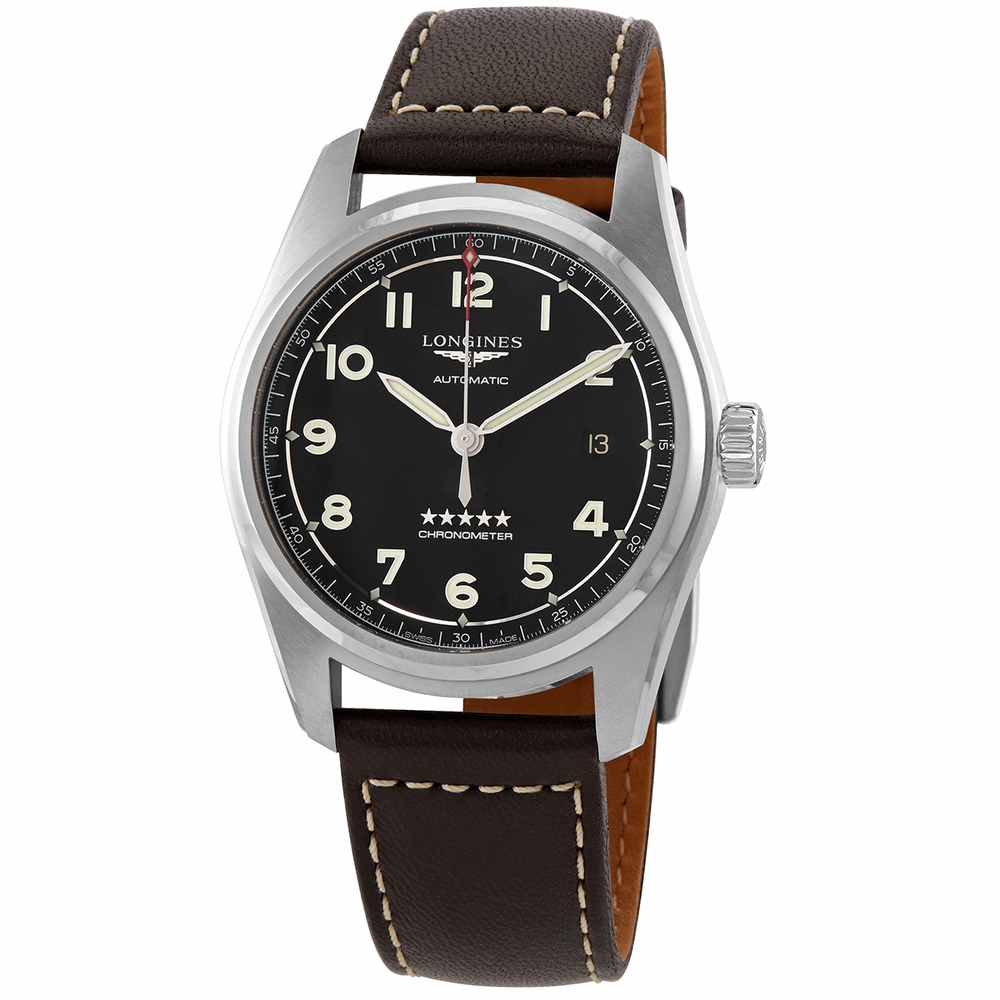 Stainless steel case with a brown leather strap. Fixed stainless steel bezel. Black dial with luminous silver-tone hands and Arabic numeral hour markers. Arabic numeral minute markers (at 5 minute intervals). Minute markers around the outer rim. Dial Type: Analog. Luminescent hands and markers. Date display at the 3 o'clock position. Caliber L888.4 automatic movement with a 64-hour power reserve. Scratch resistant sapphire crystal. Screw down crown. Solid case back. Round case shape. Case size: 40 mm. Band width: 20 mm. Tang clasp. Water resistant at 100 meters / 330 feet. Functions: hour, minute, second. Spirit Series. Luxury watch style. Watch label: Swiss Made. Longines Spirit Automatic Black Dial Mens Watch L3.810.4.53.0.