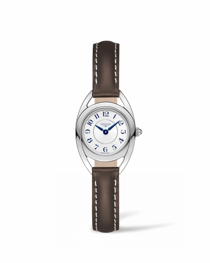 Stainless steel case with a brown leather strap. Fixed stainless steel bezel. White dial with blue hands and Arabic numeral hour markers. Dial Type: Analog. Longines calibre L963 quartz movement. Scratch resistant sapphire crystal. Pull / push crown. Solid case back. Oval case shape. Case size: 23 mm. Band width: 10 mm. Tang clasp. Water resistant at 30 meters / 100 feet. Functions: hour, minute. Equestrian Series. Dress watch style. Watch label: Swiss Made. Longines The Equestrian Collection White Dial Ladies Watch L61354732.