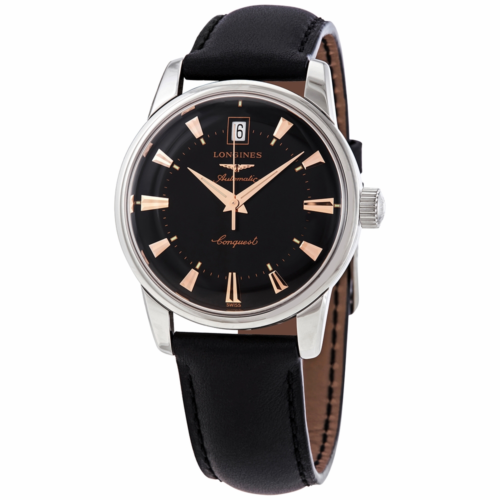 Stainless steel case with a black leather strap. Fixed stainless steel bezel. Black dial with luminous rose gold-tone hands and index hour markers. Minute markers around an inner ring. Dial Type: Analog. Luminescent hands and markers. Date display at the 12 o'clock position. Longines calibre L633 automatic movement, based upon ETA 2824-2, containing 25 Jewels, bitting at 28800 vph, and has a power reserve of approximately 38 hours. Scratch resistant hesalite crystal. Pull / push crown. Transparent case back. Round case shape. Case size: 35 mm. Case thickness: 10 mm. Band width: 18 mm. Tang clasp. Water resistant at 30 meters / 100 feet. Functions: date, hour, minute, second. Conquest Heritage Series. Luxury watch style. Watch label: Swiss Made. Longines Conquest Heritage Automatic Black Dial Mens Watch L1.611.4.52.2.