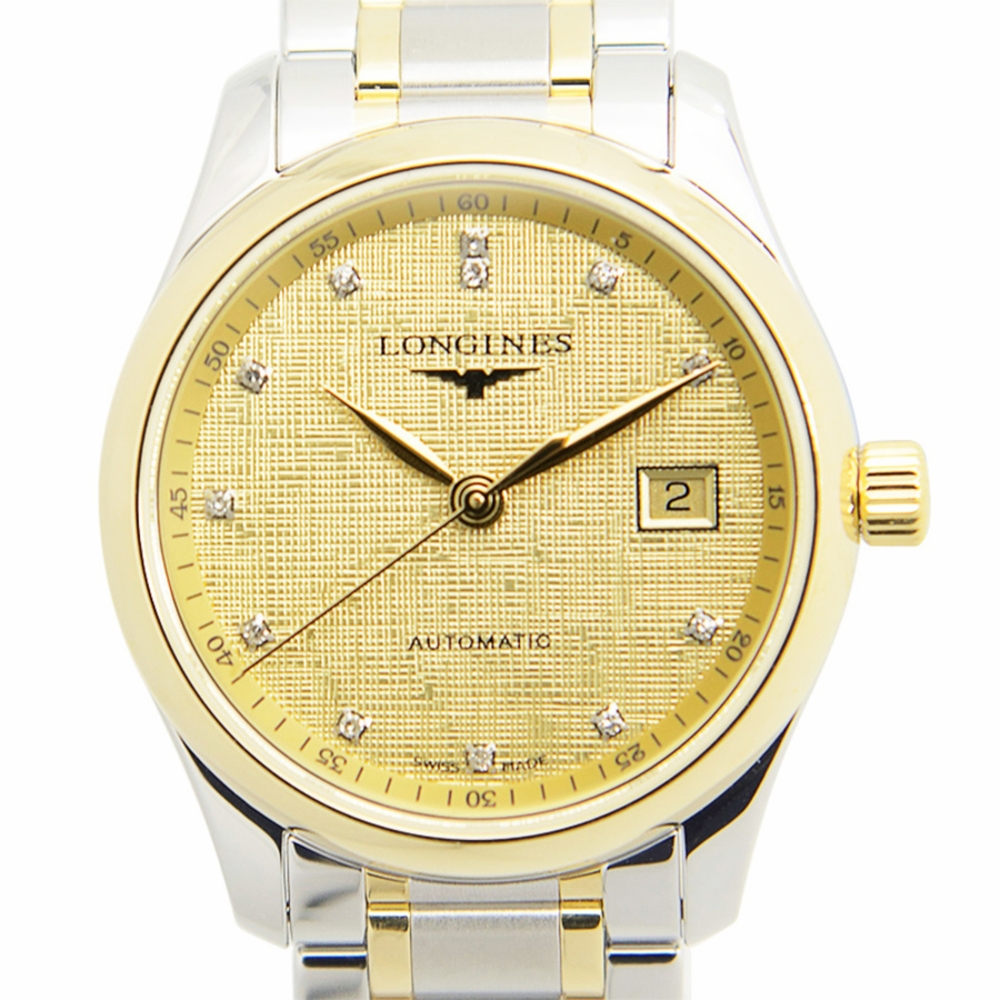 Silver-tone stainless steel case with a two-tone (silver-tone and gold-tone) stainless steel bracelet. Fixed gold-tone stainless steel bezel. Gold tone dial with gold-tone hands and diamond hour markers. Minute markers around the outer rim. Dial Type: Analog. Date display at the 3 o'clock position. Longines Calibre L595 automatic movement with a 40-hour power reserve. Scratch resistant sapphire crystal. Transparent case back. Round case shape. Case size: 29 mm. Hidden clasp. Water resistant at 30 meters / 100 feet. Functions: date, hour, minute, second. Dress watch style. Watch label: Swiss Made. Longines Master Collection Automatic Diamond Ladies Watch L2.257.5.38.7.