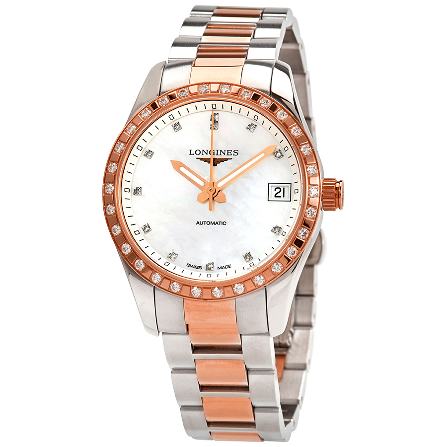 Stainless steel case with a two-tone (silver-tone and 18kt rose gold-cap) stainless steel bracelet. Fixed 18kt rose gold-cap stainless steel bezel set with diamonds. Mother of pearl dial with luminous rose gold hands and diamond hour markers. Minute markers around the outer rim. Dial Type: Analog. Luminescent hands and markers. Date display at the 3 o'clock position. Longines Calibre L888 automatic movement. Scratch resistant sapphire crystal. Pull / push crown. Transparent case back. Round case shape. Case size: 34 mm. Case thickness: 11.5 mm. Band width: 17 mm. Fold over clasp. Water resistant at 50 meters / 165 feet. Functions: date, hour, minute, second. Dress watch style. Watch label: Swiss Made. Longines Conquest Classic Automatic Mother of Pearl Diamond Dial Ladies Watch L2.385.5.88.7.