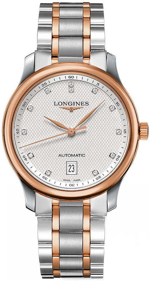 Stainless steel case with a stainless steel bracelet with 18kt rose gold (cap) links. Fixed rose gold (cap) bezel. White dial with rose gold-tone hands and diamond hour markers. Arabic numeral minute markers (at 5 minute intervals). Minute markers around the outer rim. Dial Type: Analog. Date display above the 6 o'clock position. Longines calibre L619 automatic movement, based upon ETA 2892-A2, containing 21 Jewels, bitting at 28800 vph, and has a power reserve of approximately 42 hours. Scratch resistant sapphire crystal. Pull / push crown. Transparent case back. Round case shape. Case size: 38.5 mm. Case thickness: 9.5 mm. Band width: 20 mm. Fold over clasp with a push button release. Water resistant at 30 meters / 100 feet. Functions: date, hour, minute, second. Master Collection Series. Luxury watch style. Watch label: Swiss Made. Longines Master Collection Automatic Diamond White Dial Mens Watch L2.628.5.97.7.
