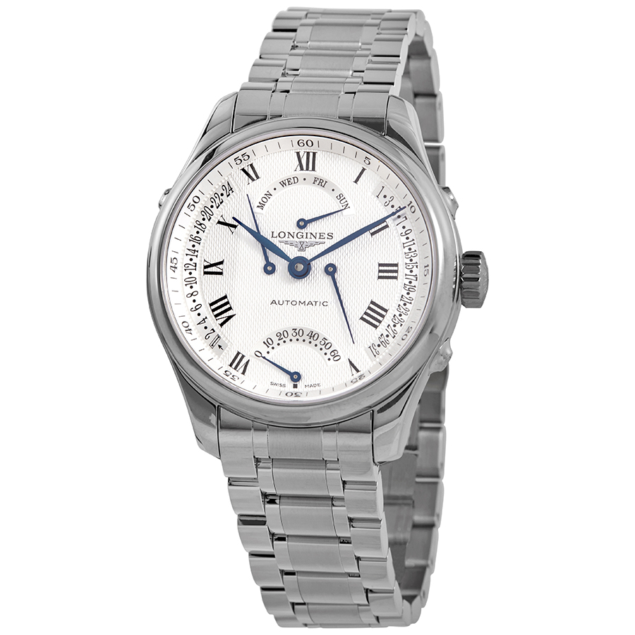 Stainless steel case with a stainless steel bracelet. Fixed stainless steel bezel. Silver dial with blue hands and Roman numeral hour markers. Minute markers around the outer rim. Dial Type: Analog. Retrograde date. Four displays showing: seconds, 24 hour, date and day of the week. Longines calibre L698 automatic movement with a 46-hour power reserve. Scratch resistant sapphire crystal. Pull / push crown. Transparent case back. Round case shape. Case size: 41 mm. Case thickness: 16.10 mm. Band width: 22 mm. Fold over clasp. Water resistant at 30 meters / 100 feet. Functions: date, day, GMT, second time zone, hour, minute, second. Luxury watch style. Watch label: Swiss Made. Longines Master Collection Automatic Silver Dial Mens Watch L2.715.4.71.6.