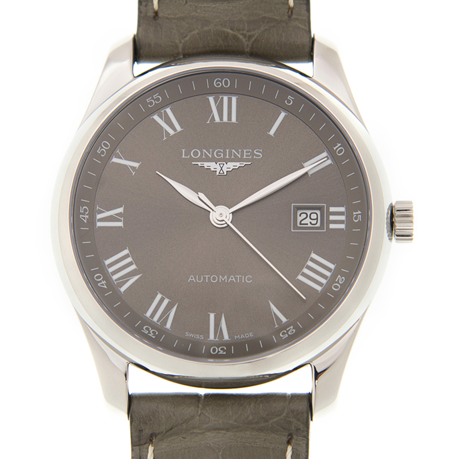 Stainless steel case with a grey leather strap. Fixed stainless steel bezel. Grey dial with luminous silver-tone hands and Roman numeral hour markers. Arabic numeral minute markers (at 5 minute intervals). Minute markers around the outer rim. Dial Type: Analog. Luminescent hands. Date display at the 3 o'clock position. Longines caliber L888 automatic movement with a 65-hour power reserve. Scratch resistant sapphire crystal. Pull / push crown. Transparent case back. Round case shape. Case size: 40 mm. Band width: 21 mm. Butterfly clasp. Water resistant at 30 meters / 100 feet. Functions: date, hour, minute, second. Additional Info: original box, manual (complete accessories). Master Collection Series. Luxury watch style. Watch label: Swiss Made. Longines Master Collection Grey Dial Mens Watch L2.793.4.71.3.