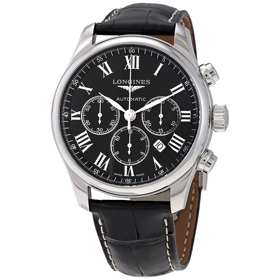 Silver-tone stainless steel case with a black stainless steel bracelet. Fixed bezel. Black dial with silver-tone hands and Roman numeral hour markers. Dial Type: Analog. Date display between 4 and 5 o'clock position. Chronograph - three sub-dials displaying: 60 seconds, 30 minutes, and 12 hours. Longines Calibre L688 Automatic movement, based upon ETA A08.L01, bitting at 28800 vph, and has a power reserve of approximately 54 hours. Scratch resistant sapphire crystal. Transparent case back. Round case shape. Case size: 44 mm. Water resistant at 30 meters / 100 feet. Functions: chronograph, column wheel, date, hour, minute, small second. Watch label: Swiss Made. Longines Master Collection Black Dial Automatic Mens Chronogrph Watch L2.859.4.51.7.
