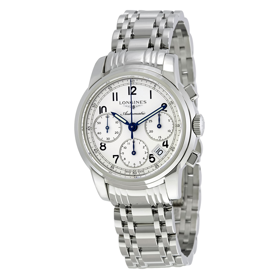 Stainless steel case with a stainless steel bracelet. Fixed stainless steel bezel. Silver dial with luminous blue hands and Arabic numeral hour markers. Arabic numeral minute markers (at 5 minute intervals). Minute markers around the outer rim. Dial Type: Analog. Luminescent hands. Date display between the 4 and 5 o'clock positions. Chronograph - three sub-dials displaying: 60 second, 30 minute and 12 hour. Longines calibre L688 automatic movement, based upon ETA A08.L01, containing 27 Jewels, bitting at 28800 vph, and has a power reserve of approximately 54 hours. Scratch resistant sapphire crystal. Pull / push crown. Transparent case back. Round case shape. Case size: 39 mm. Case thickness: 14 mm. Band width: 19 mm. Fold over clasp with a push button release. Water resistant at 30 meters / 100 feet. Functions: chronograph, column wheel, date, hour, minute, small second. Saint-imier Collection Series. Luxury watch style. Watch label: Swiss Made. Item Variations: L27534736. Longines Saint-Imier Chronograph Automatic Mens Watch L2.753.4.73.6.