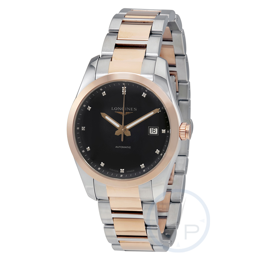 Stainless steel an case with a stainless steel bracelet with 18kt pink gold center links. Fixed 18kt pink gold bezel. Black dial with luminous 18kt pink gold hands and diamond hour markers. Minute markers around the outer rim. Dial Type: Analog. Date display at the 3 o'clock position. Longines calibre L619/888 automatic movement with a 42-hour power reserve. Scratch resistant sapphire crystal. Pull / push crown. Transparent case back. Round case shape. Case size: 40 mm. Band width: 20 mm. Deployment clasp with a push button release. Water resistant at 50 meters / 165 feet. Functions: date, hour, minute, second. Additional Info: dial set with 13 top wesselton vs diamonds, for a total of 0.052 carats. Luxury watch style. Watch label: Swiss Made. Item Variations: L27855587 L2.785.5.58.7. Longines Conquest Classic Black Diamond Dial Automatic Mens Watch L2.785.5.58.7.