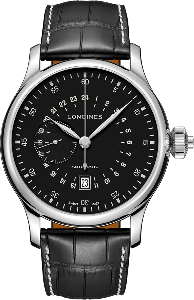 Stainless steel case with a black alligator leather strap. Fixed silver-tone bezel. Black dial with silver-toned hands and index hour markers. Minute markers around the outer rim. Dial Type: Analog. Date display at the 6 o'clock position. Chronograph - sub-dials displaying: small seconds sub-dial. Longines Calibre L789 automatic movement with a 54-hour power reserve. Scratch resistant sapphire crystal. Case size: 47.5 mm. Case thickness: 14.75 mm. Round case shape. Buckle clasp. Water resistant at 30 meters / 100 feet. Functions: chronograph, column wheel, monopoussoir, date, hour, minute, small second. Luxury watch style. Watch label: Swiss Made. Longines Heritage Chronograph Automatic Mens Watch L2.797.4.53.0.