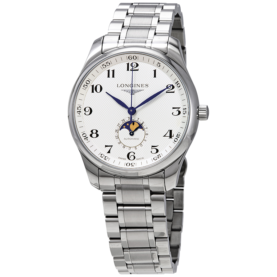 Stainless steel case with a stainless steel bracelet. Fixed stainless steel bezel. Silver "barleycorn" dial with blue hands and Arabic numeral hour markers. Minute markers around the outer rim. Dial Type: Analog. Date display at the 6 o'clock position. Combination: date / moon phase sub-dial. Longines calibre L899 automatic movement, based upon ETA A31.L91, containing 21 Jewels, bitting at 25200 vph, and has a power reserve of approximately 64 hours. Scratch resistant sapphire crystal. Pull / push crown. Transparent case back. Round case shape. Case size: 42 mm. Band width: 21 mm. Fold over clasp with a push button release. Water resistant at 30 meters / 100 feet. Functions: date, hour, minute, second, moonphase. Master Collection Series. Luxury watch style. Watch label: Swiss Made. Item Variations: L29194786. Longines Master Collection Automatic Mens Watch L2.919.4.78.6.