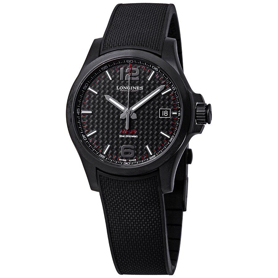 Black PVD stainless steel case with a black rubber strap. Fixed black PVD bezel. Black carbon dial with luminous black hands and index hour markers. Arabic numerals mark the 6 and 12 o'clock positions. Minute markers around the outer rim. Dial Type: Analog. Luminescent hands and markers. Date display at the 3 o'clock position. Longines calibre L288 quartz movement. Scratch resistant sapphire crystal. Screw down crown. Solid case back. Round case shape. Case size: 41 mm. Case thickness: 13 mm. Band width: 20 mm. Deployment clasp with a push button release. Water resistant at 50 meters / 165 feet. Functions: date, hour, minute, second. Casual watch style. Watch label: Swiss Made. Longines Conquest V.H.P. Black Carbon Dial Mens Watch L3.716.2.66.9.
