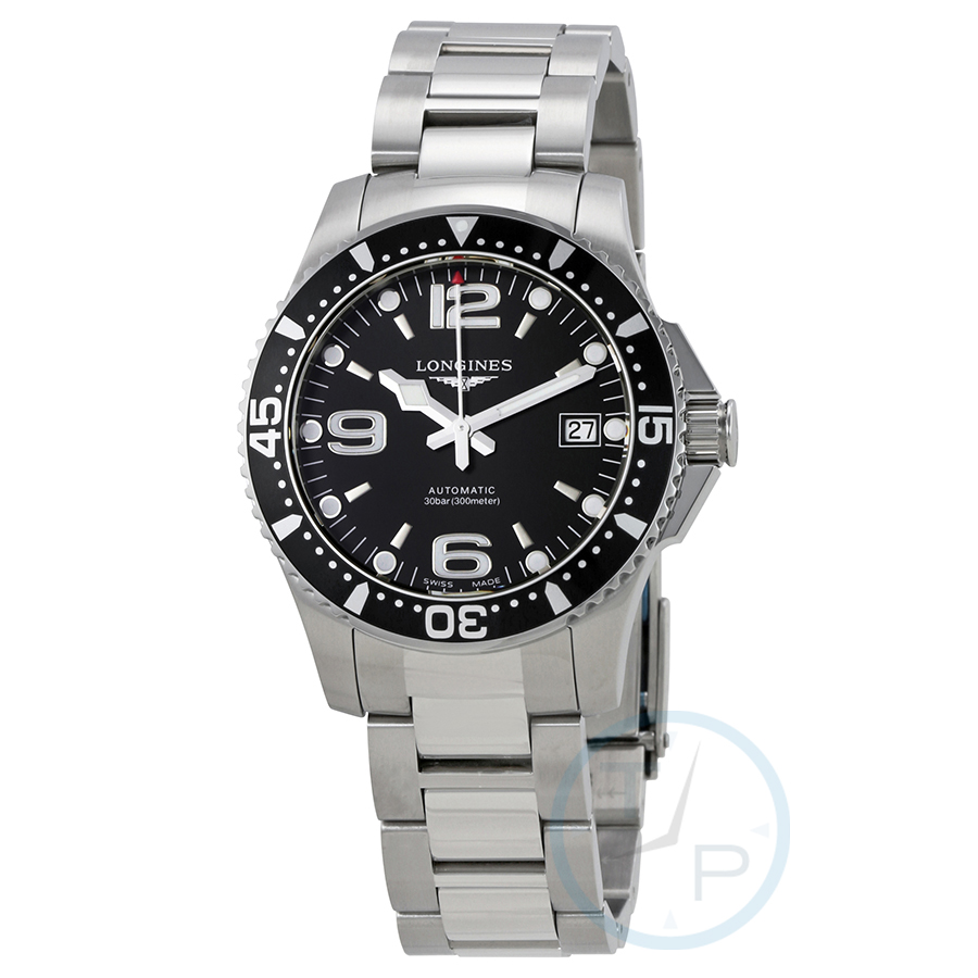 Stainless steel case with a stainless steel bracelet. Uni-directional rotating stainless steel bezel with a black top ring. Black dial with luminous silver-tone snowflake-shape hands and index hour markers. Arabic numerals mark the 6, 9 and 12 o'clock positions. Minute markers around the outer rim. Dial Type: Analog. Luminescent hands and markers. Date display at the 3 o'clock position. Longines calibre L619/888 automatic movement, based upon ETA 2892, containing 21 Jewels, bitting at 25200 vph, and has a power reserve of approximately 64 hours. Scratch resistant sapphire crystal. Screw down crown. Solid case back. Round case shape. Case size: 39 mm. Case thickness: 11.85 mm. Band width: 20 mm. Fold over clasp. Water resistant at 300 meters / 1000 feet. Functions: date, hour, minute, second. Hydroconquest Series. Dive watch style. Watch label: Swiss Made. Longines HydroConquest Automatic Black Dial Mens Watch L3.741.4.56.6.