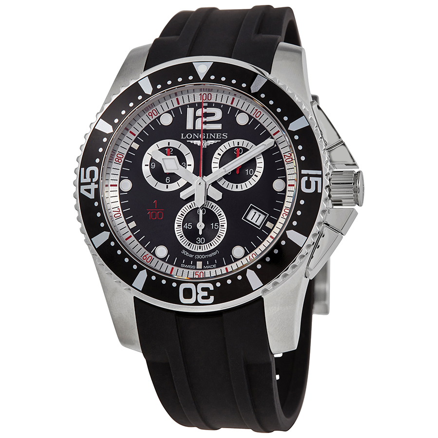 Stainless steel case with a black rubber strap. Uni-directional rotating stainless steel bezel with a black ring. Sunray black dial with luminous silver-tone hands and index hour markers. An Arabic numeral appears at the 12 o'clock position. Minute markers around the outer rim. Dial Type: Analog. Luminescent hands and markers. Date display at the 4 o'clock position. Chronograph - three sub-dials displaying: 60 second, 30 minute and 1/10th of a second. Longines calibre 440 quartz movement. Scratch resistant mineral crystal. Screw down crown. Solid case back. Round case shape. Case size: 47.5 mm. Band width: 24 mm. Tang clasp. Water resistant at 300 meters / 1000 feet. Functions: chronograph, date, hour, minute, second. Hydroconquest Series. Dive watch style. Watch label: Swiss Made. Longines HydroConquest Chronograph Quartz Mens Watch L3.843.4.56.2.