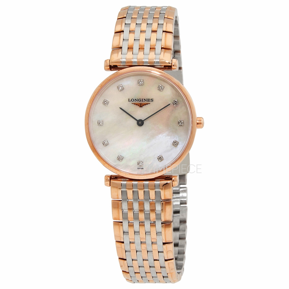 Rose gold PVD stainless steel case with a two-tone (silver-tone and rose gold PVD) stainless steel bracelet. Fixed rose gold PVD bezel. White dial with black hands and diamond hour markers. Dial Type: Analog. Longines Calibre L420 quartz movement. Scratch resistant sapphire crystal. Pull / push crown. Solid case back. Round case shape. Case size: 29 mm. Case thickness: 4.5 mm. Band width: 16 mm. Fold over clasp with a safety release. Water resistant at 30 meters / 100 feet. Functions: hour, minute. La Grande Classique Series. Dress watch style. Watch label: Swiss Made. Longines La Grande Classique Diamond Ladies Watch L4.512.1.97.7.