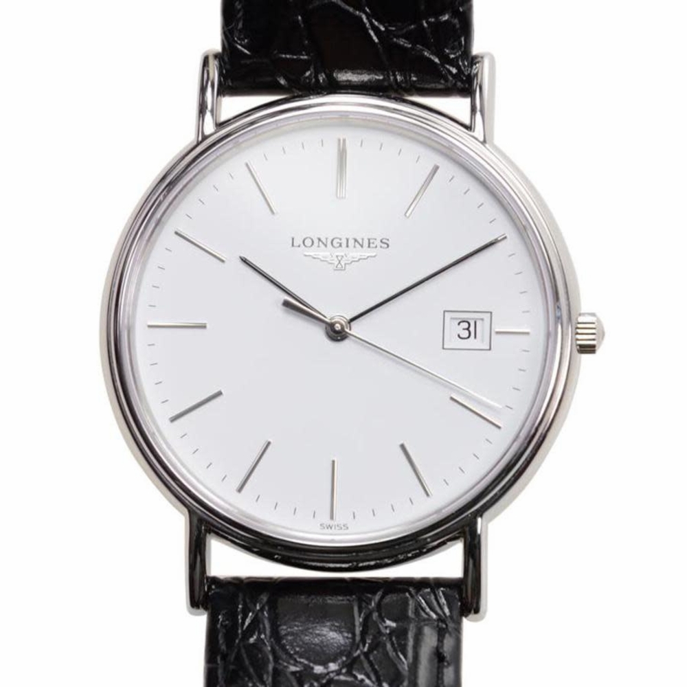Stainless steel case with a black (alligator) leather strap. Fixed stainless steel bezel. White dial with black hands and index hour markers. Minute markers around the outer rim. Dial Type: Analog. Date display at the 3 o'clock position. Longines calibre L157 quartz movement. Scratch resistant sapphire crystal. Pull / push crown. Solid case back. Round case shape. Case size: 38 mm. Case thickness: 6 mm. Tang clasp. Water resistant at 30 meters / 100 feet. Functions: date, hour, minute, second. La Grande Classique Series. Dress watch style. Watch label: Swiss Made. Item Variations: L4 790 4 12 2, L4-790-4-12-2, L4/790/4/12/2, L47904122. Longines La Grande Classique Presence White Dial Mens Watch L4.790.4.12.2.