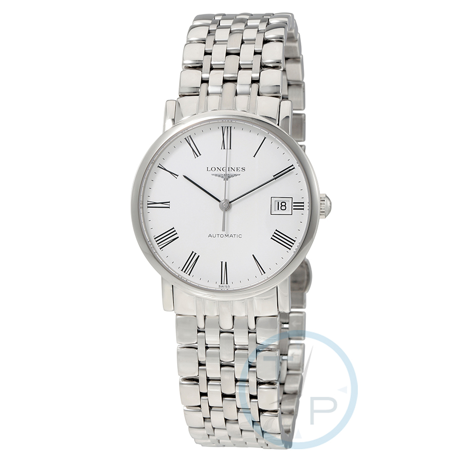 Stainless steel case with a stainless steel bracelet. Fixed stainless steel bezel. White dial with black hands and Roman numeral hour markers. Minute markers around the outer rim. Dial Type: Analog. Date display at the 3 o'clock position. Longines calibre L619/888 automatic movement, based upon ETA 2892, containing 21 Jewels, bitting at 25200 vph, and has a power reserve of approximately 64 hours. Scratch resistant sapphire crystal. Pull / push crown. Transparent case back. Round case shape. Case size: 34.50 mm. Case thickness: 6 mm. Band width: 20 mm. Fold over clasp with a push button release. Water resistant at 30 meters / 100 feet. Functions: date, hour, minute, second. Elegant Series. Luxury watch style. Watch label: Swiss Made. Longines Elegant Automatic White Dial Ladies Steel Watch L4.809.4.11.6.