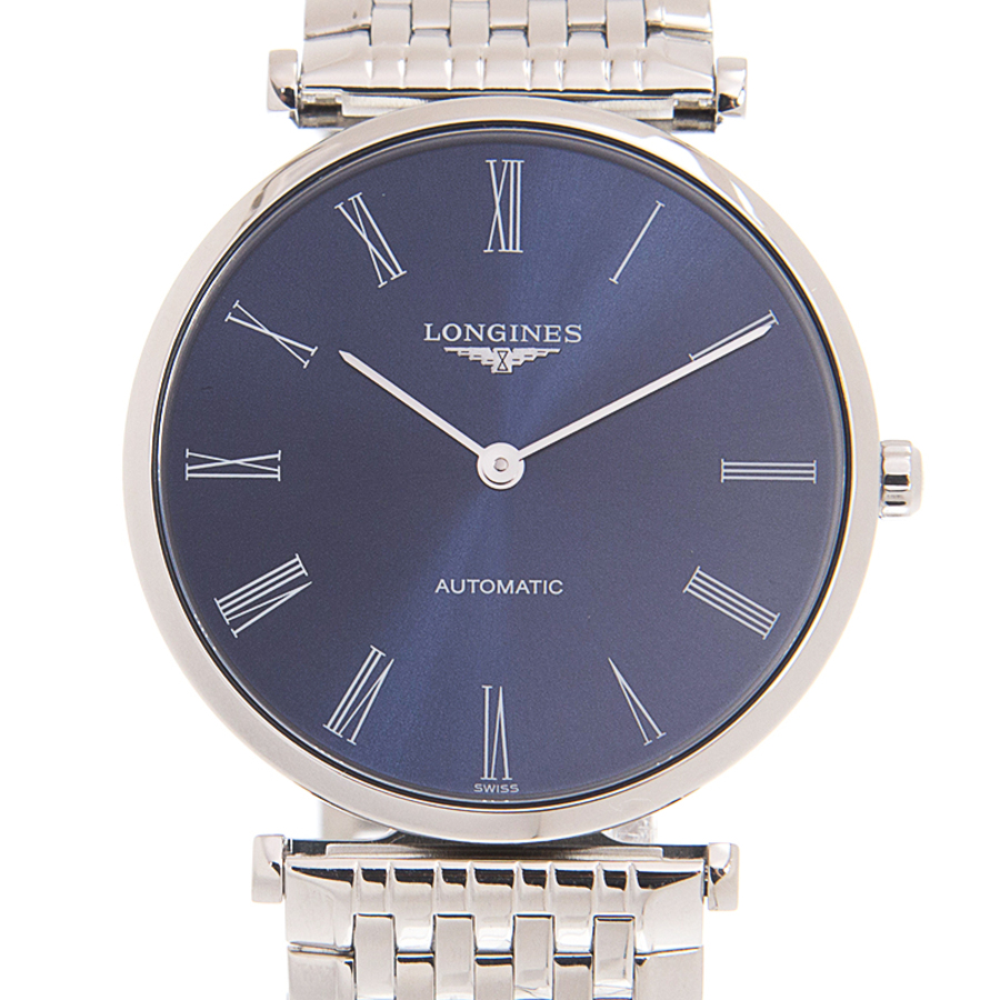 Stainless steel case with a stainless steel bracelet. Fixed stainless steel bezel. Blue dial with silver-tone hands and Roman numeral hour markers. Dial Type: Analog. Longines calibre L591 automatic movement, based upon ETA A20.L01, containing 22 Jewels, bitting at 28800 vph, and has a power reserve of approximately 40 hours. Scratch resistant sapphire crystal. Pull / push crown. Transparent case back. Round case shape. Case size: 36 mm. Case thickness: 7.6 mm. Band width: 20 mm. Fold over clasp with a push button release. Water resistant at 30 meters / 100 feet. Functions: hour, minute. Additional Info: original box, manual (complete accessories). La Grande Classique Series. Luxury watch style. Watch label: Swiss Made. Longines La Grande Classique Blue Dial Ladies Watch L4.908.4.94.6.